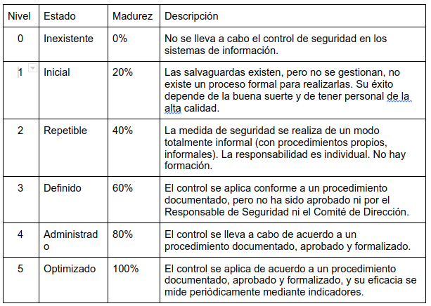 - Nivel 0 – Inexistente: no hay evidencia del control (ej. no se hacen copias de seguridad).