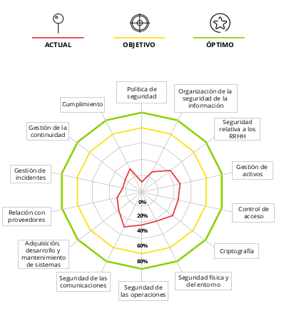 Con los resultados del análisis de madurez se definen objetivos realistas de mejora. La guía propone agrupar los controles en dominios temáticos (políticas, organización, RR. HH., seguridad física, comunicaciones, operaciones, control de acceso, adquisición de sistemas, desarrollo, gestión de incidentes, continuidad, cumplimiento legal) y representar los resultados en un gráfico radar.