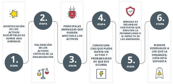 El análisis de riesgos es el puente entre la situación actual y las acciones futuras. INCIBE lo describe en varias etapas que conectan con el proceso visto anteriormente.