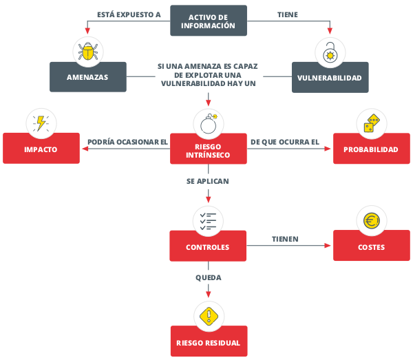 Activos expuestos a amenazas → Amenazas aprovechan vulnerabilidades → Se produce un impacto → Los controles reducen probabilidad/impacto → Queda un riesgo residual que debemos decidir si aceptar, mitigar, transferir o eliminar.